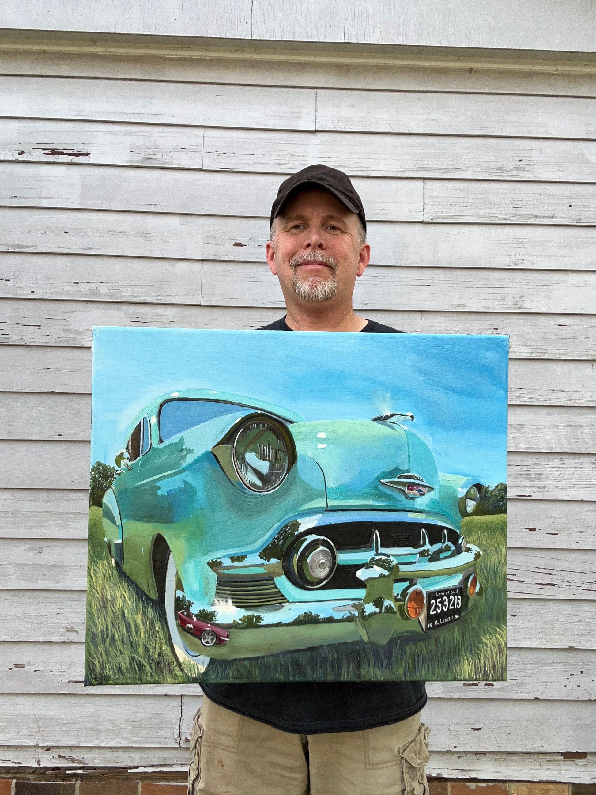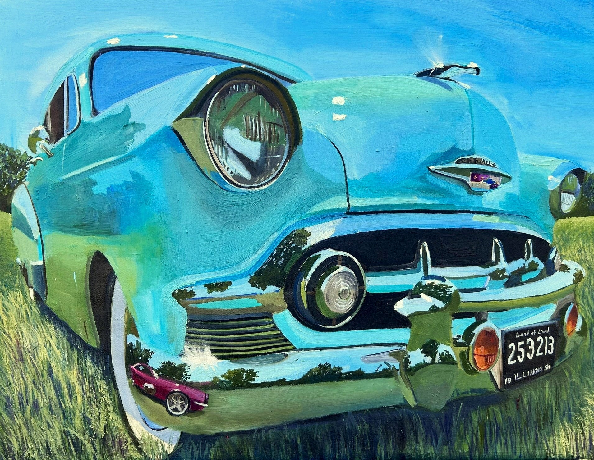 There’s something about a ’53 Chevy that just grabs you. The lines, the chrome, the way it looks like it could be cruising down a small-town main street on a summer evening… I wanted to capture that feeling in this painting. It’s not just a car—it’s a little piece of history, a reminder of simpler times, and a car with its own personality. Every curve and highlight in this piece is about celebrating that classic 50s style and the spirit of the open road.